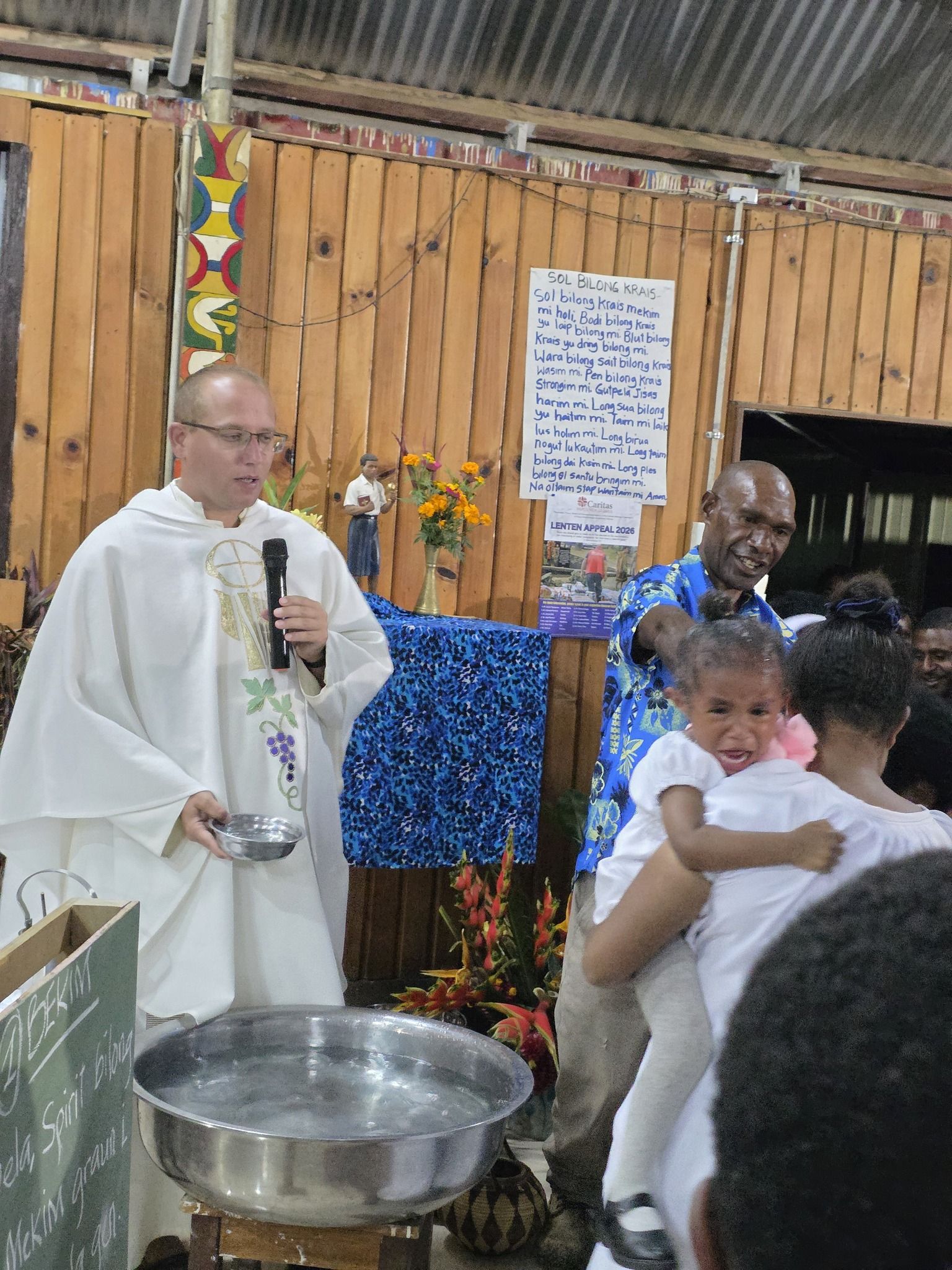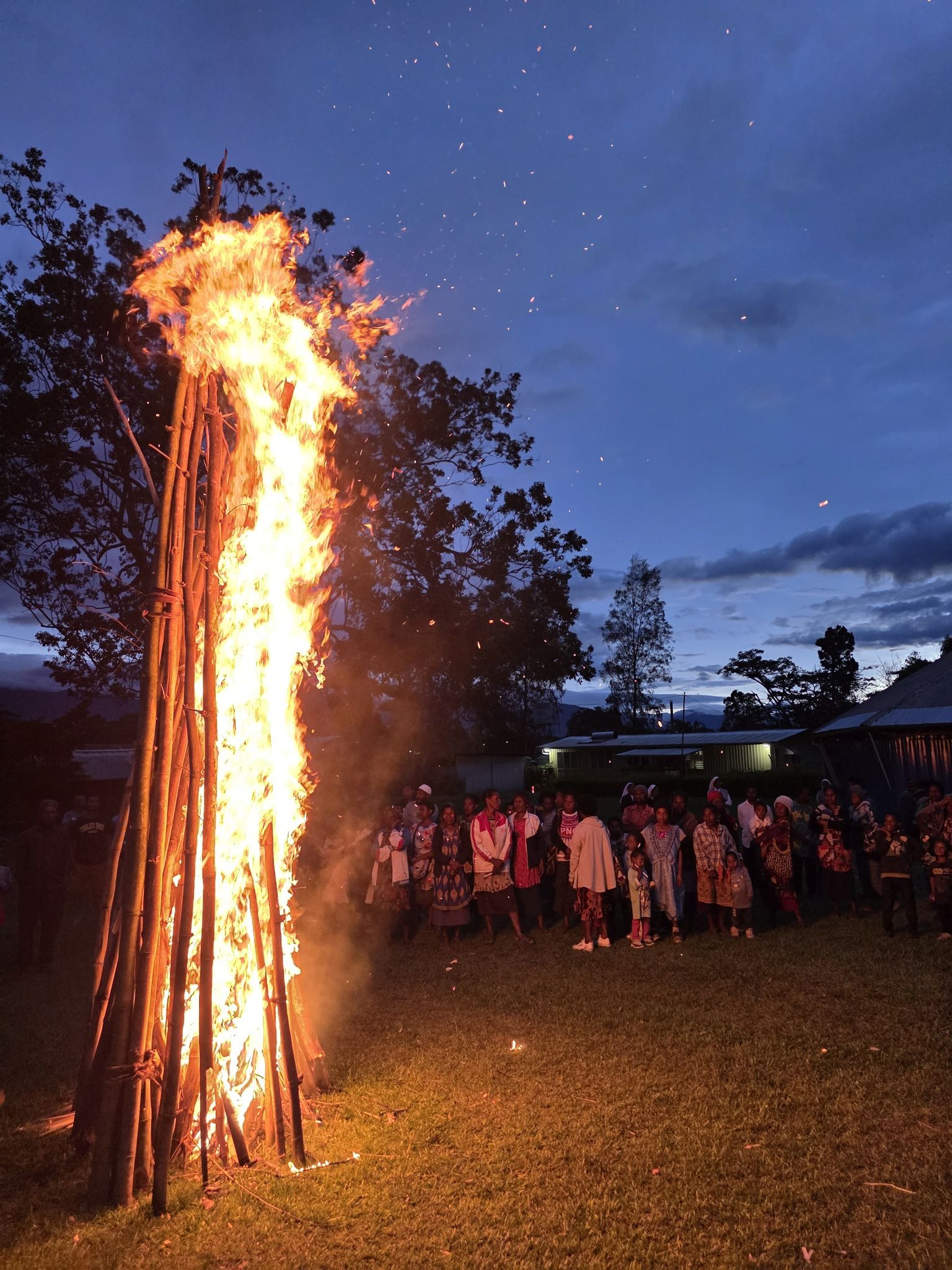 Liturgia Ognia: Ognisko rozpalone przed kościołem jest jedynym punktem świetlnym w promieniu wielu kilometrów. Od niego zapalany jest Paschał, a następnie małe świece w dłoniach wiernych. Widok setek twarzy rozświetlonych płomieniami w sercu papuańskiej nocy jest niezapomniany.